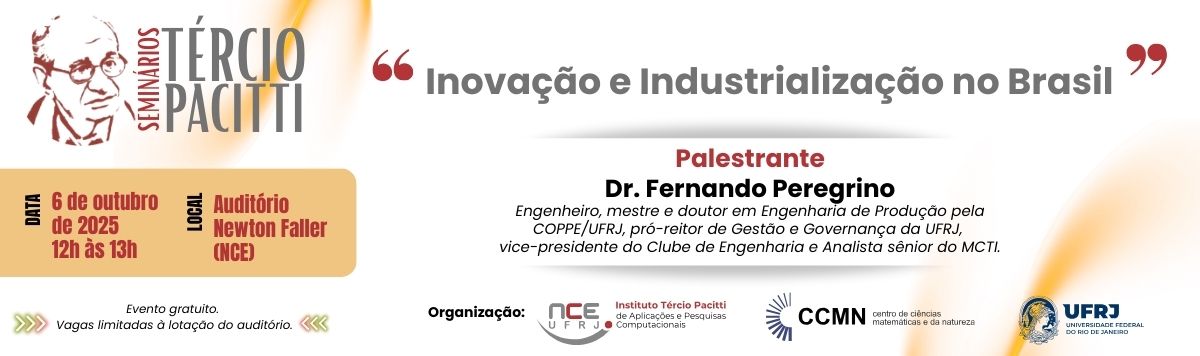 A palestra acontecerá às 10h, no Auditório Maria Irene Mello do Instituto Tércio Pacitti de Aplicações e Pesquisas Computacionais (NCE/UFRJ), localizado no Prédio do CCMN.